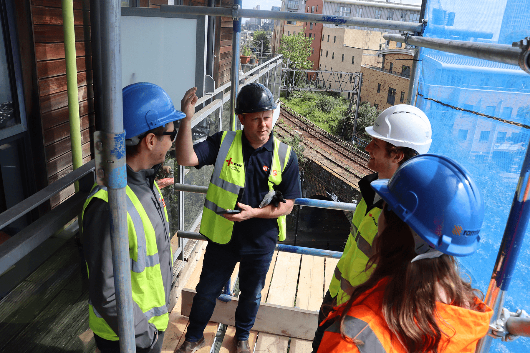 Four construction professionals in high-visibility gear gathered on a scaffold balcony, looking at a smartphone held by one man.