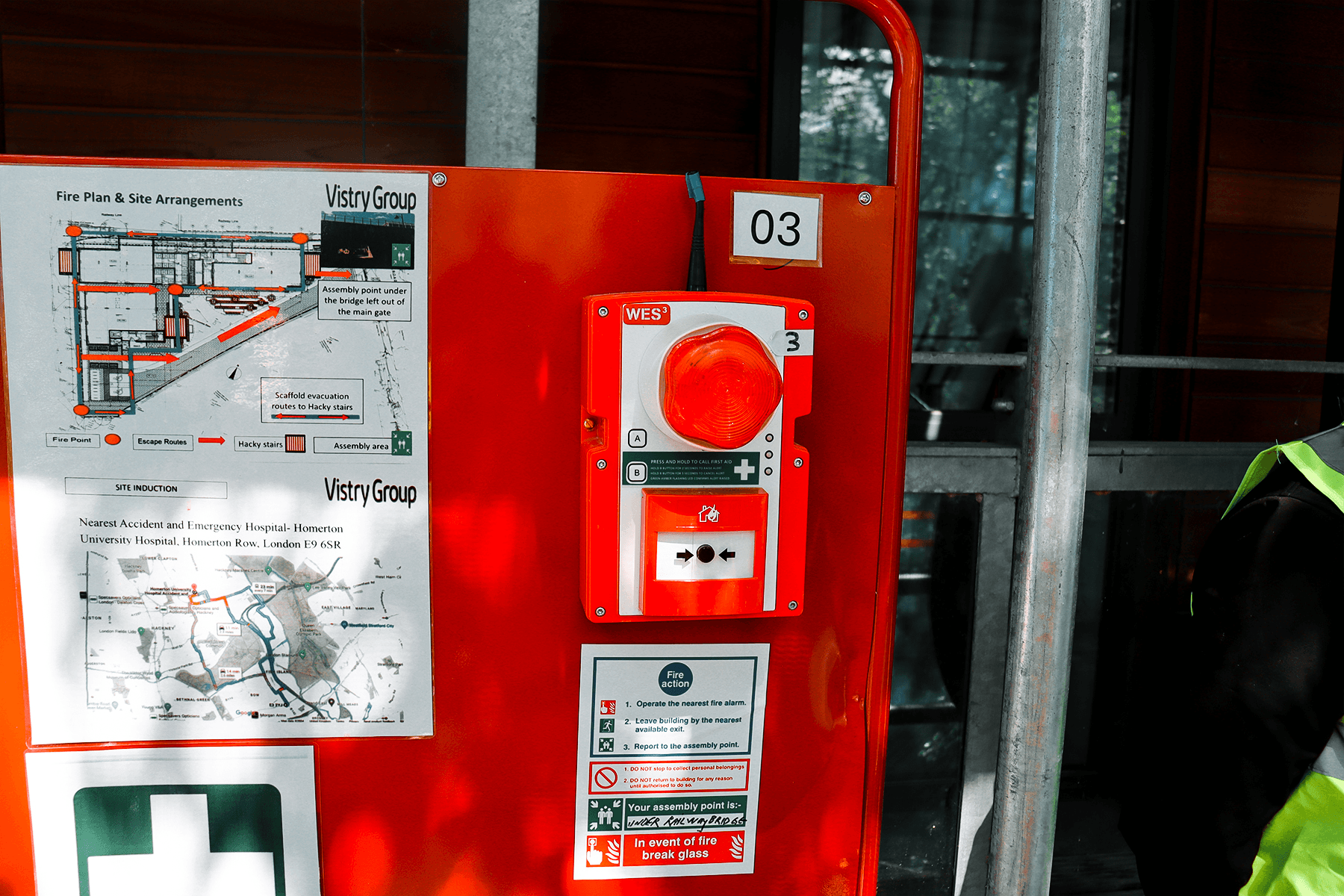 A red fire safety board featuring a wireless fire alarm with a red strobe light and a site evacuation map.