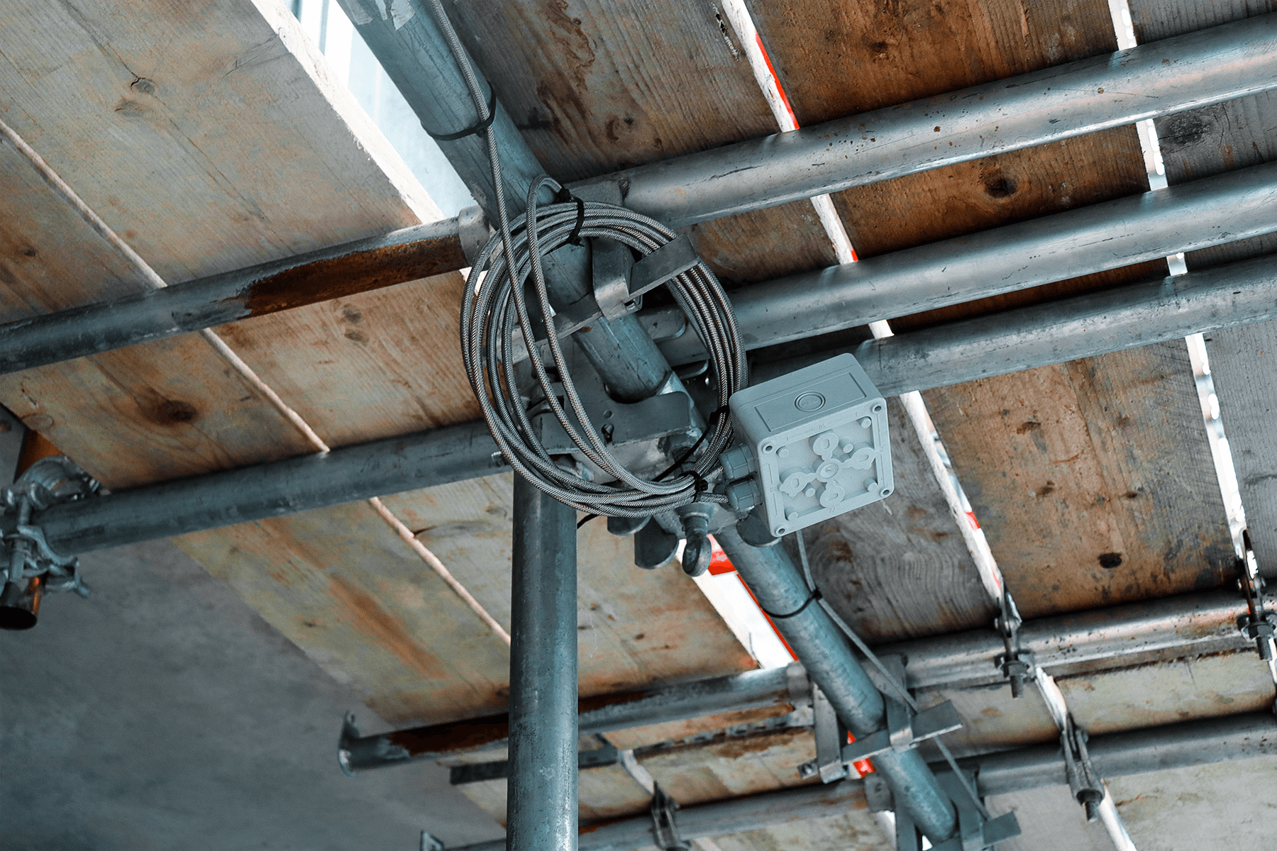 A grey junction box and coiled steel cable attached to the underside of wooden scaffold planks.