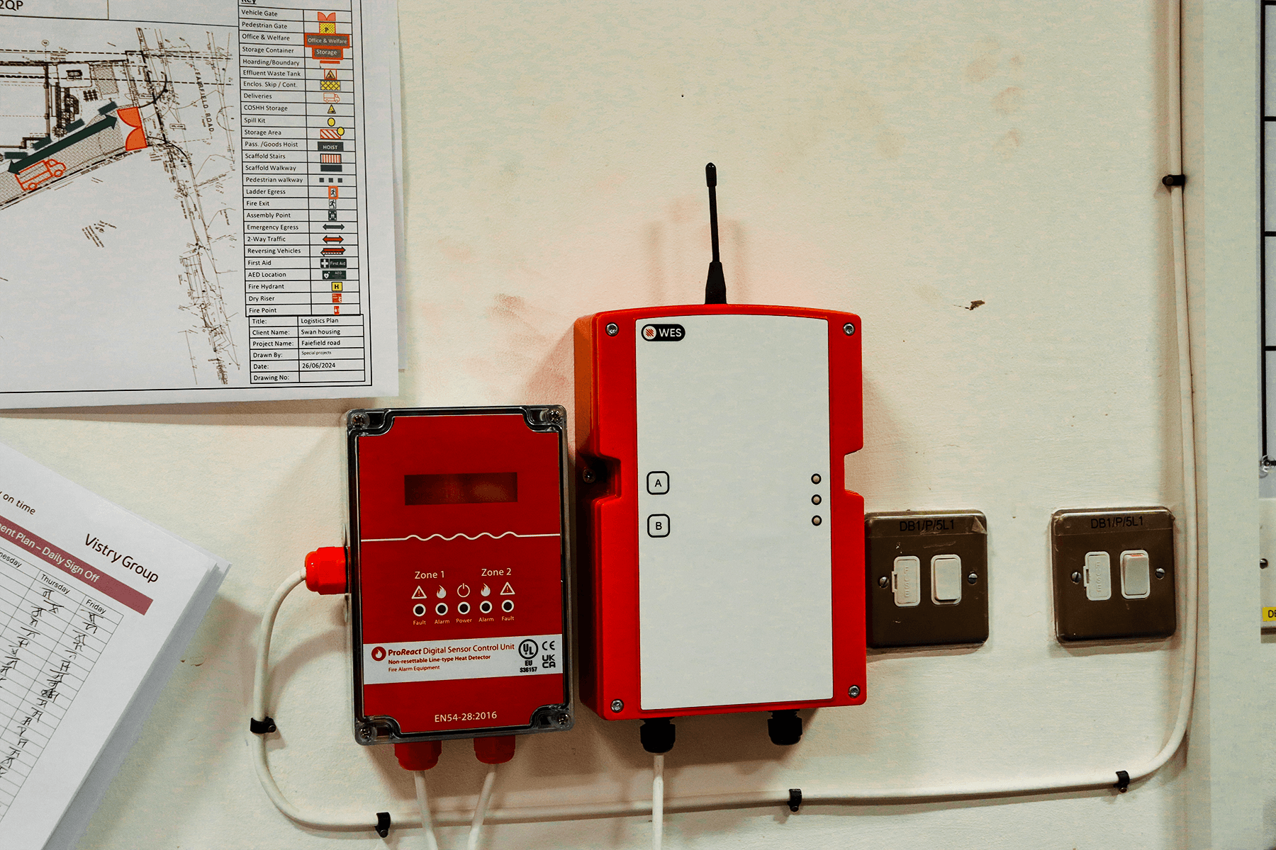 Two red control boxes mounted on a white wall: one for ProReact heat detection and one for the WES alarm system.